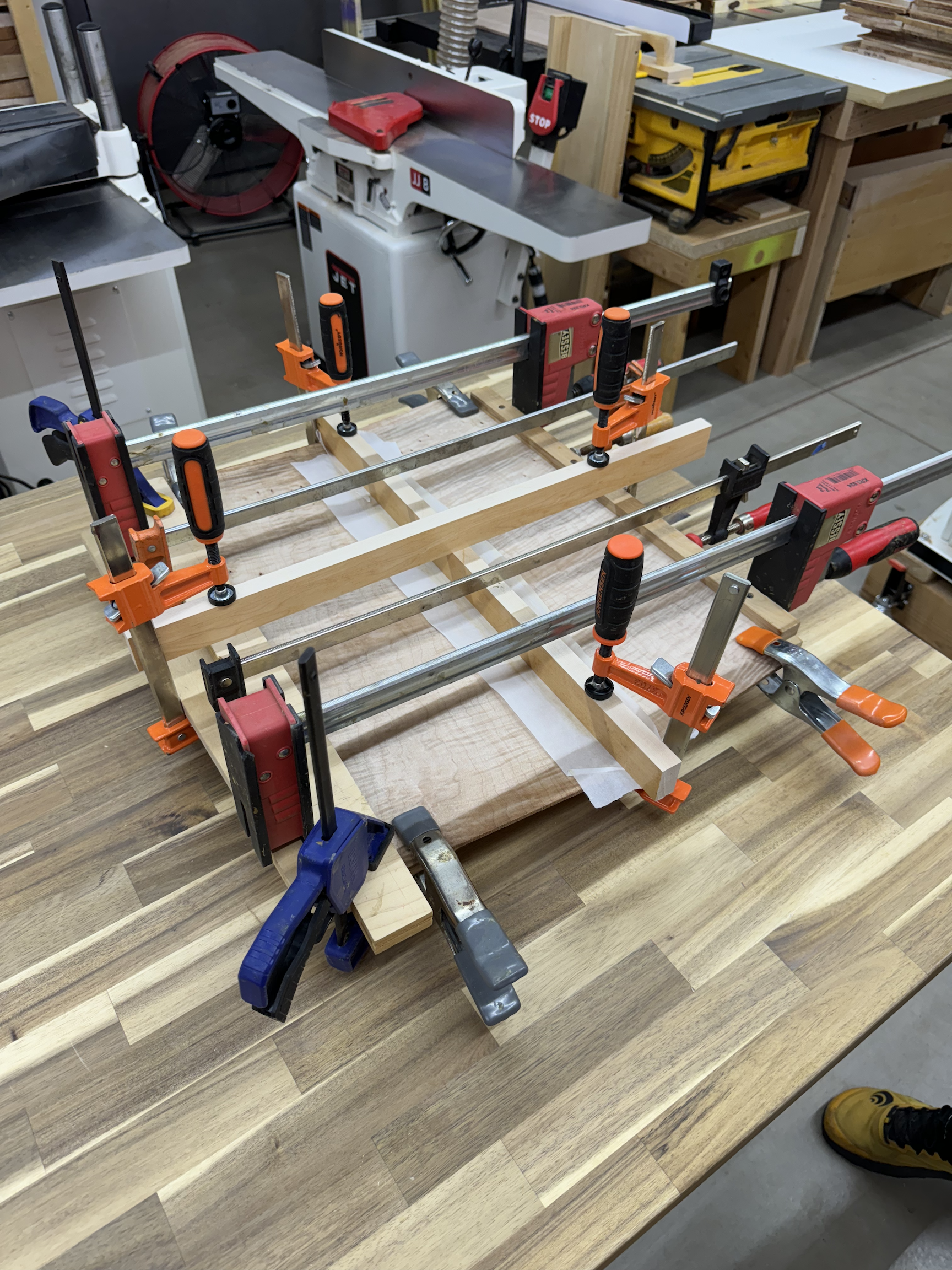 Don’t forget to add some more clamps to keep the various cauls in place! Give every clamp a once-over to make sure everything is secure and tight and let it sit.